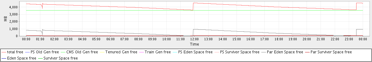 avg(total free) = 4069.72 avg(PS Old Gen free) = 0.00 avg(CMS Old Gen free) = 3534.54 avg(Tenured Gen free) = 0.00 avg(Train Gen free) = 0.00 avg(PS Eden Space free) = 0.00 avg(PS Survivor Space free) = 0.00 avg(Par Eden Space free) = 458.85 avg(Par Survivor Space free) = 76.33 avg(Eden Space free) = 0.00 avg(Survivor Space free) = 0.00