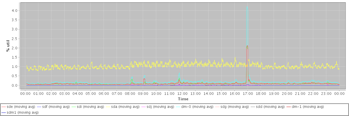 avg(sde) = 0.09 avg(sdf) = 0.00 avg(sdi) = 0.09 avg(sda) = 1.04 avg(sdj) = 0.00 avg(dm-0) = 0.19 avg(sdg) = 0.00 avg(sdd) = 0.00 avg(dm-1) = 0.00 avg(sdm1) = 0.00