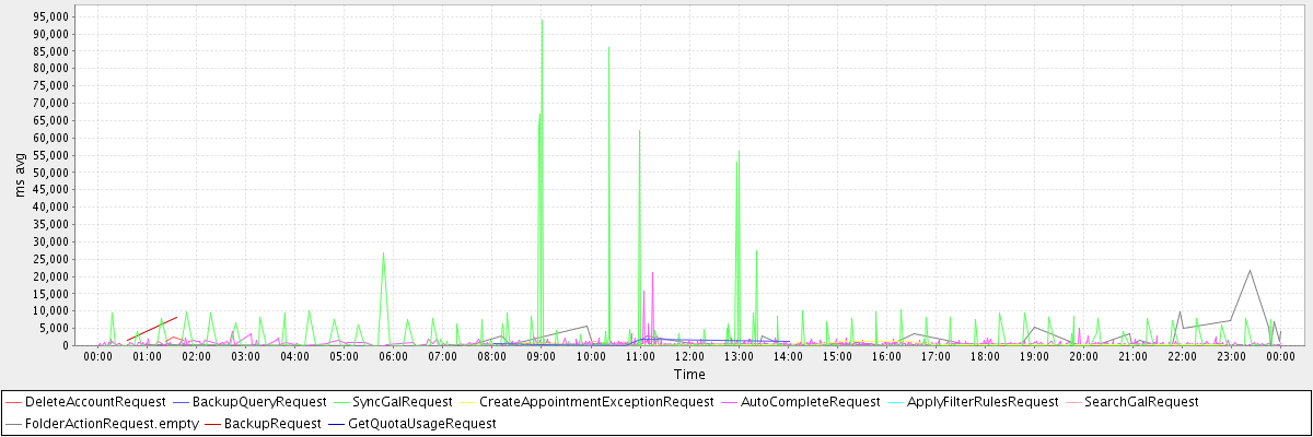 avg(DeleteAccountRequest) = 1691.33 avg(BackupQueryRequest) = 862.80 avg(SyncGalRequest) = 1620.74 avg(CreateAppointmentExceptionRequest) = 519.77 avg(AutoCompleteRequest) = 561.35 avg(ApplyFilterRulesRequest) = 73436.00 avg(SearchGalRequest) = 454.14 avg(FolderActionRequest.empty) = 2311.63 avg(BackupRequest) = 4875.00 avg(GetQuotaUsageRequest) = 2874.00