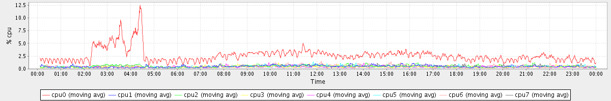 avg(cpu0) = 2.64 avg(cpu1) = 0.49 avg(cpu2) = 0.51 avg(cpu3) = 0.38 avg(cpu4) = 0.34 avg(cpu5) = 0.40 avg(cpu6) = 0.49 avg(cpu7) = 0.38