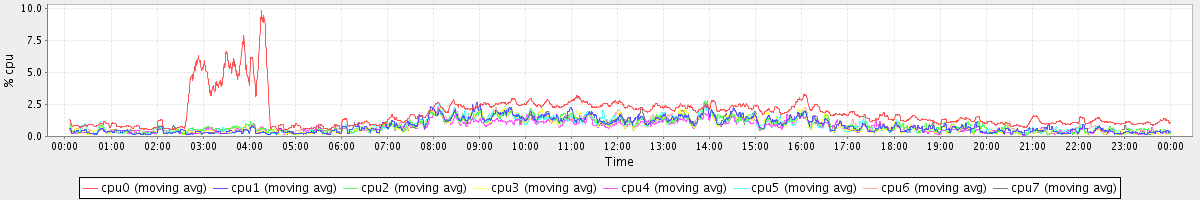 avg(cpu0) = 1.86 avg(cpu1) = 0.84 avg(cpu2) = 0.85 avg(cpu3) = 0.78 avg(cpu4) = 0.69 avg(cpu5) = 0.78 avg(cpu6) = 0.83 avg(cpu7) = 0.77