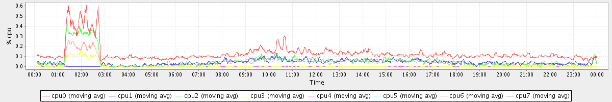 avg(cpu0) = 1.32 avg(cpu1) = 0.29 avg(cpu2) = 0.32 avg(cpu3) = 0.25 avg(cpu4) = 0.26 avg(cpu5) = 0.26 avg(cpu6) = 0.30 avg(cpu7) = 0.25