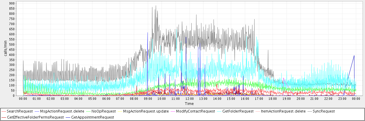 max(SearchRequest) = 143.00 max(MsgActionRequest.delete) = 616.00 max(NoOpRequest) = 195.00 max(MsgActionRequest.update) = 101.00 max(ModifyContactRequest) = 175.00 max(GetFolderRequest) = 646.00 max(ItemActionRequest.delete) = 82.00 max(SyncRequest) = 878.00 max(GetEffectiveFolderPermsRequest) = 97.00 max(GetAppointmentRequest) = 571.00