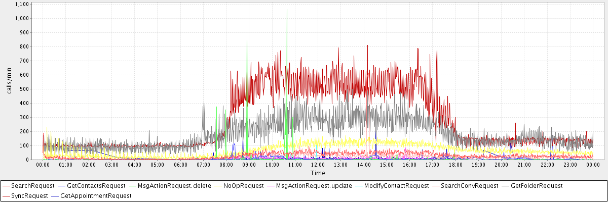 max(SearchRequest) = 614.00 max(GetContactsRequest) = 117.00 max(MsgActionRequest.delete) = 1063.00 max(NoOpRequest) = 229.00 max(MsgActionRequest.update) = 92.00 max(ModifyContactRequest) = 114.00 max(SearchConvRequest) = 96.00 max(GetFolderRequest) = 500.00 max(SyncRequest) = 812.00 max(GetAppointmentRequest) = 254.00