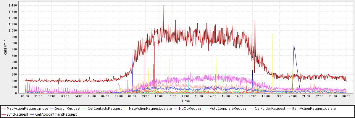 max(MsgActionRequest.move) = 842.00 max(SearchRequest) = 143.00 max(GetContactsRequest) = 244.00 max(MsgActionRequest.delete) = 948.00 max(NoOpRequest) = 327.00 max(AutoCompleteRequest) = 219.00 max(GetFolderRequest) = 308.00 max(ItemActionRequest.delete) = 138.00 max(SyncRequest) = 1399.00 max(GetAppointmentRequest) = 780.00