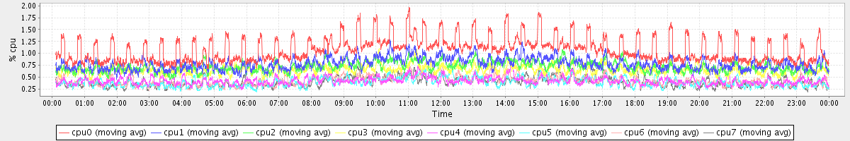 avg(cpu0) = 1.09 avg(cpu1) = 0.79 avg(cpu2) = 0.72 avg(cpu3) = 0.66 avg(cpu4) = 0.43 avg(cpu5) = 0.40 avg(cpu6) = 0.43 avg(cpu7) = 0.41