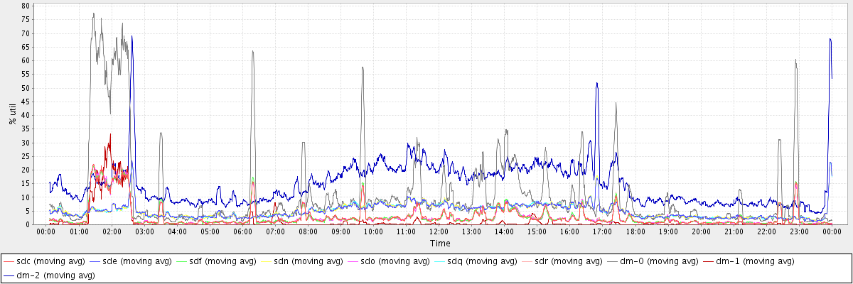 avg(sdc) = 2.86 avg(sde) = 4.97 avg(sdf) = 2.90 avg(sdn) = 4.99 avg(sdo) = 2.89 avg(sdq) = 5.01 avg(sdr) = 2.89 avg(dm-0) = 11.00 avg(dm-1) = 1.25 avg(dm-2) = 14.77