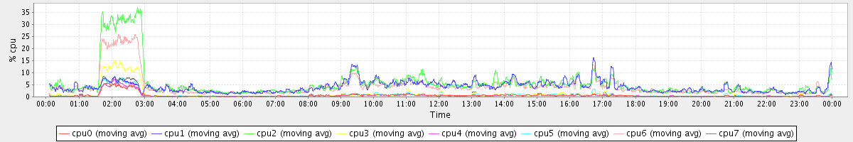 avg(cpu0) = 1.16 avg(cpu1) = 0.27 avg(cpu2) = 0.29 avg(cpu3) = 0.21 avg(cpu4) = 0.19 avg(cpu5) = 0.22 avg(cpu6) = 0.25 avg(cpu7) = 0.21