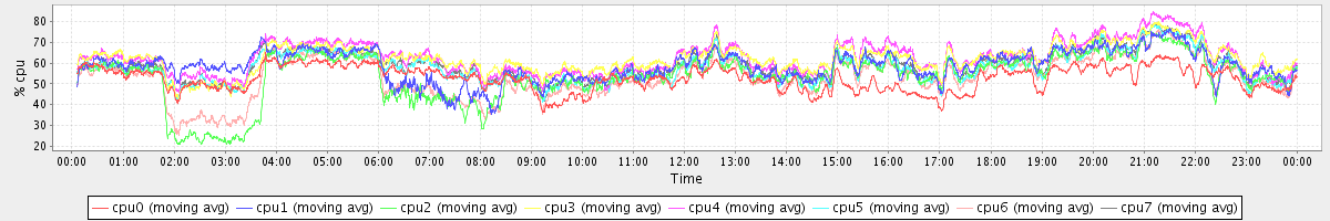 avg(cpu0) = 52.66 avg(cpu1) = 58.53 avg(cpu2) = 53.60 avg(cpu3) = 62.18 avg(cpu4) = 62.61 avg(cpu5) = 57.85 avg(cpu6) = 53.36 avg(cpu7) = 58.97