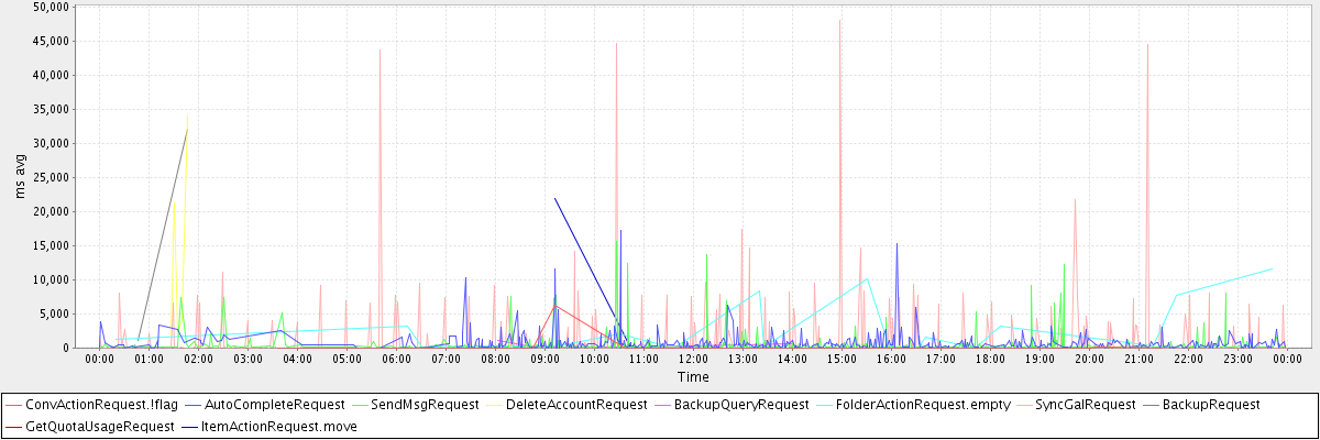 avg(ConvActionRequest.!flag) = 299.35 avg(AutoCompleteRequest) = 773.96 avg(SendMsgRequest) = 428.30 avg(DeleteAccountRequest) = 12674.40 avg(BackupQueryRequest) = 475.00 avg(FolderActionRequest.empty) = 2564.90 avg(SyncGalRequest) = 1009.75 avg(BackupRequest) = 16644.00 avg(GetQuotaUsageRequest) = 1199.00 avg(ItemActionRequest.move) = 10963.00
