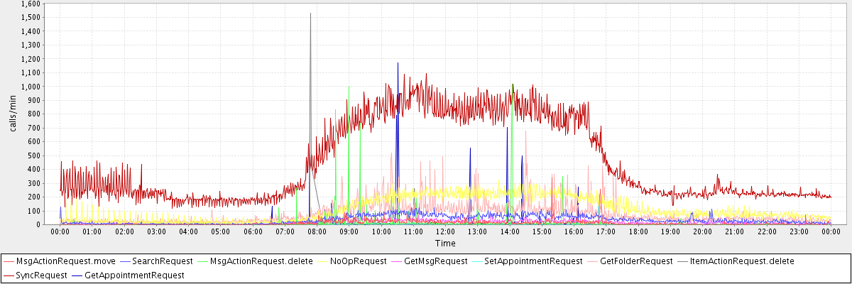 max(MsgActionRequest.move) = 338.00 max(SearchRequest) = 130.00 max(MsgActionRequest.delete) = 1019.00 max(NoOpRequest) = 330.00 max(GetMsgRequest) = 130.00 max(SetAppointmentRequest) = 176.00 max(GetFolderRequest) = 677.00 max(ItemActionRequest.delete) = 1529.00 max(SyncRequest) = 1092.00 max(GetAppointmentRequest) = 1169.00