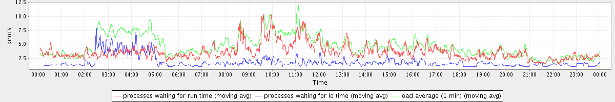 avg(processes waiting for run time) = 3.43 avg(processes waiting for io time) = 1.10 avg(load average (1 min)) = 4.67