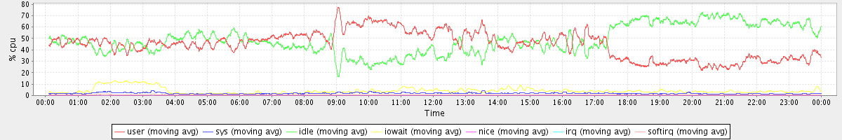 avg(user) = 44.69 avg(sys) = 1.90 avg(idle) = 48.66 avg(iowait) = 4.17 avg(nice) = 0.00 avg(irq) = 0.03 avg(softirq) = 0.54