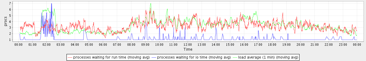 avg(processes waiting for run time) = 3.02 avg(processes waiting for io time) = 0.31 avg(load average (1 min)) = 3.33