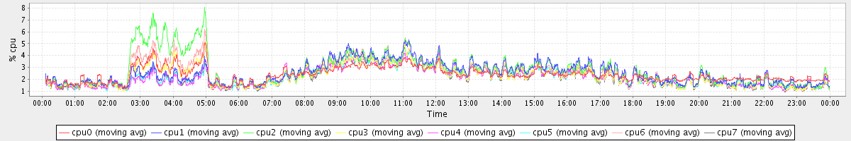 avg(cpu0) = 2.38 avg(cpu1) = 2.48 avg(cpu2) = 2.76 avg(cpu3) = 2.28 avg(cpu4) = 2.11 avg(cpu5) = 2.16 avg(cpu6) = 2.51 avg(cpu7) = 2.14