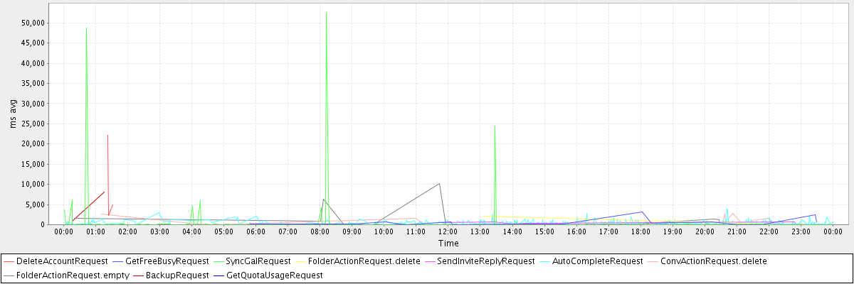 avg(DeleteAccountRequest) = 9785.67 avg(GetFreeBusyRequest) = 459.91 avg(SyncGalRequest) = 534.93 avg(FolderActionRequest.delete) = 822.67 avg(SendInviteReplyRequest) = 476.67 avg(AutoCompleteRequest) = 441.14 avg(ConvActionRequest.delete) = 424.49 avg(FolderActionRequest.empty) = 1316.65 avg(BackupRequest) = 4417.50 avg(GetQuotaUsageRequest) = 1093.00