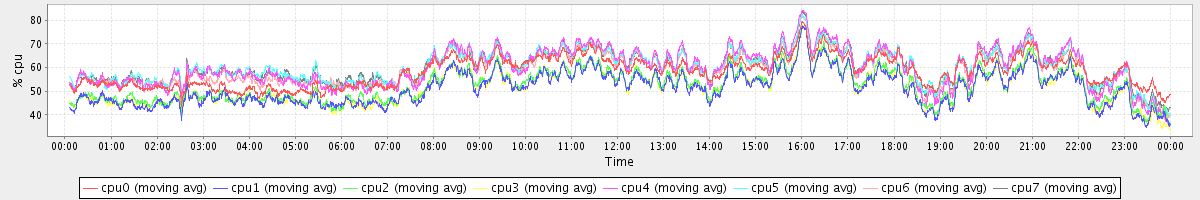 avg(cpu0) = 35.75 avg(cpu1) = 42.37 avg(cpu2) = 37.54 avg(cpu3) = 43.94 avg(cpu4) = 36.90 avg(cpu5) = 35.96 avg(cpu6) = 33.08 avg(cpu7) = 36.32