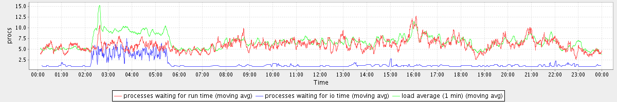 avg(processes waiting for run time) = 6.01 avg(processes waiting for io time) = 0.77 avg(load average (1 min)) = 6.80