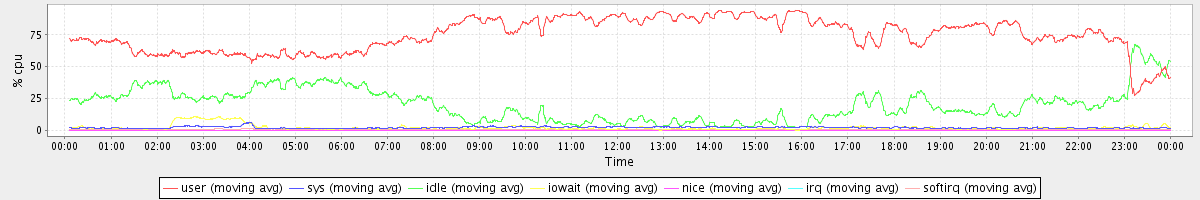 avg(user) = 74.53 avg(sys) = 2.22 avg(idle) = 20.33 avg(iowait) = 2.22 avg(nice) = 0.00 avg(irq) = 0.04 avg(softirq) = 0.65