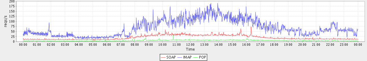 Host zm04.stanford.edu: Mailboxd: Request Rate by Client Protocol