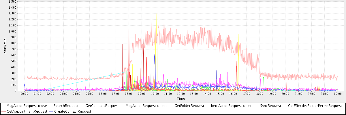 max(MsgActionRequest.move) = 1098.00 max(SearchRequest) = 610.00 max(GetContactsRequest) = 341.00 max(MsgActionRequest.delete) = 1294.00 max(GetFolderRequest) = 317.00 max(ItemActionRequest.delete) = 322.00 max(SyncRequest) = 1267.00 max(GetEffectiveFolderPermsRequest) = 337.00 max(GetAppointmentRequest) = 1434.00 max(CreateContactRequest) = 343.00