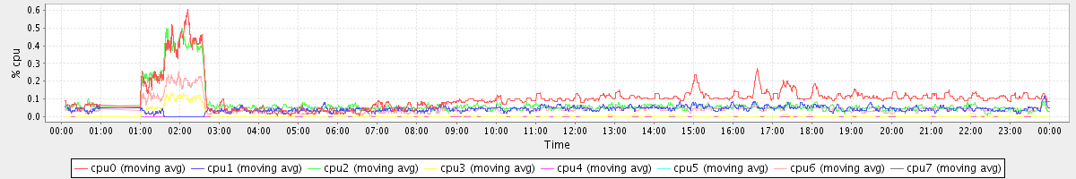 avg(cpu0) = 1.15 avg(cpu1) = 0.31 avg(cpu2) = 0.37 avg(cpu3) = 0.29 avg(cpu4) = 0.24 avg(cpu5) = 0.26 avg(cpu6) = 0.30 avg(cpu7) = 0.26