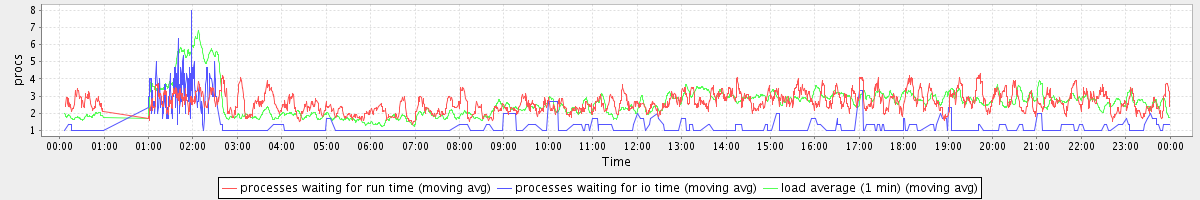 avg(processes waiting for run time) = 2.14 avg(processes waiting for io time) = 0.41 avg(load average (1 min)) = 2.67