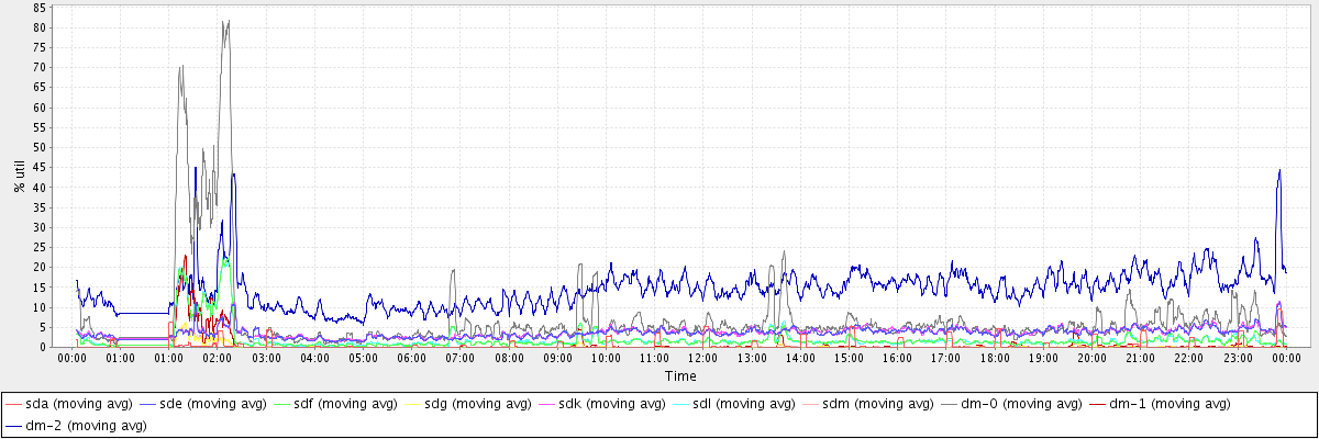 avg(sda) = 0.48 avg(sde) = 3.69 avg(sdf) = 2.17 avg(sdg) = 0.21 avg(sdk) = 3.78 avg(sdl) = 2.22 avg(sdm) = 0.22 avg(dm-0) = 8.06 avg(dm-1) = 0.79 avg(dm-2) = 14.67