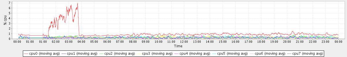 avg(cpu0) = 1.19 avg(cpu1) = 0.24 avg(cpu2) = 0.27 avg(cpu3) = 0.21 avg(cpu4) = 0.17 avg(cpu5) = 0.21 avg(cpu6) = 0.23 avg(cpu7) = 0.20