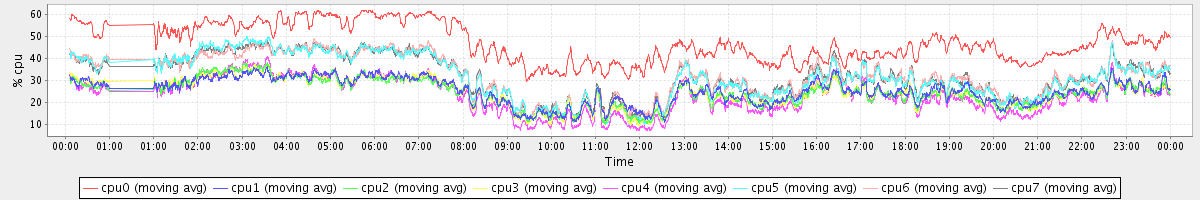 avg(cpu0) = 47.14 avg(cpu1) = 25.25 avg(cpu2) = 24.70 avg(cpu3) = 24.69 avg(cpu4) = 23.23 avg(cpu5) = 31.62 avg(cpu6) = 32.30 avg(cpu7) = 32.09