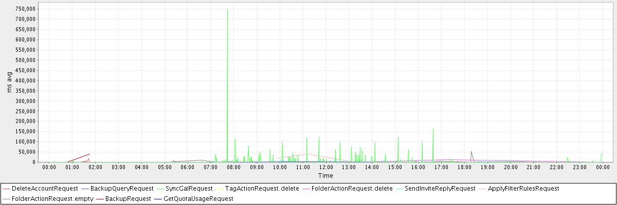 avg(DeleteAccountRequest) = 3987.56 avg(BackupQueryRequest) = 731.80 avg(SyncGalRequest) = 3955.47 avg(TagActionRequest.delete) = 683.50 avg(FolderActionRequest.delete) = 2687.40 avg(SendInviteReplyRequest) = 908.97 avg(ApplyFilterRulesRequest) = 20427.67 avg(FolderActionRequest.empty) = 2797.64 avg(BackupRequest) = 19865.00 avg(GetQuotaUsageRequest) = 2714.00