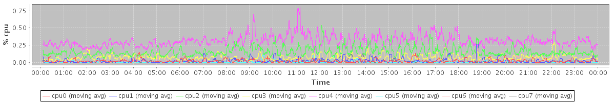 avg(cpu0) = 0.59 avg(cpu1) = 0.35 avg(cpu2) = 0.25 avg(cpu3) = 0.25 avg(cpu4) = 0.29 avg(cpu5) = 0.21 avg(cpu6) = 0.17 avg(cpu7) = 0.14
