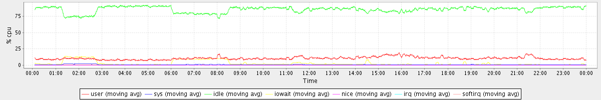 avg(user) = 10.55 avg(sys) = 0.90 avg(idle) = 85.40 avg(iowait) = 2.90 avg(nice) = 0.00 avg(irq) = 0.01 avg(softirq) = 0.23
