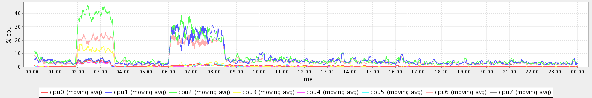 avg(cpu0) = 34.69 avg(cpu1) = 13.24 avg(cpu2) = 12.22 avg(cpu3) = 12.12 avg(cpu4) = 10.01 avg(cpu5) = 10.77 avg(cpu6) = 12.79 avg(cpu7) = 11.40