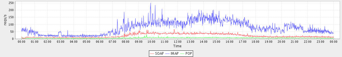 Host zm04.stanford.edu: Mailboxd: Request Rate by Client Protocol