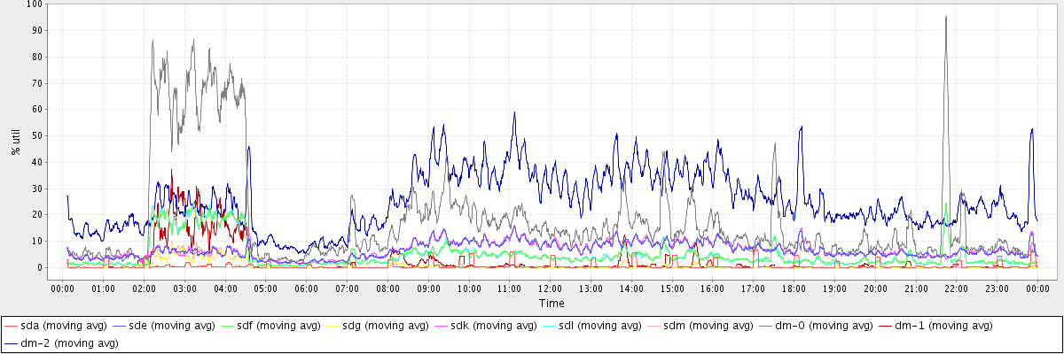 avg(sda) = 0.59 avg(sde) = 6.54 avg(sdf) = 4.81 avg(sdg) = 0.58 avg(sdk) = 6.68 avg(sdl) = 4.86 avg(sdm) = 0.62 avg(dm-0) = 17.88 avg(dm-1) = 2.26 avg(dm-2) = 25.29