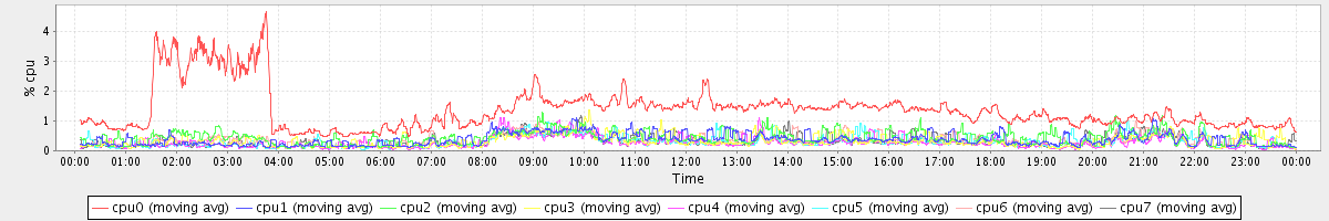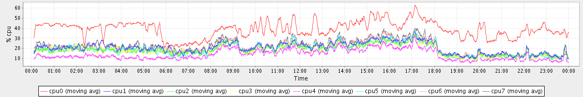 avg(cpu0) = 1.38 avg(cpu1) = 0.38 avg(cpu2) = 0.43 avg(cpu3) = 0.32 avg(cpu4) = 0.27 avg(cpu5) = 0.30 avg(cpu6) = 0.35 avg(cpu7) = 0.31
