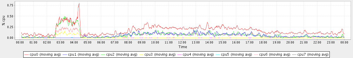 avg(cpu0) = 1.85 avg(cpu1) = 0.86 avg(cpu2) = 0.89 avg(cpu3) = 0.77 avg(cpu4) = 0.64 avg(cpu5) = 0.78 avg(cpu6) = 0.82 avg(cpu7) = 0.75