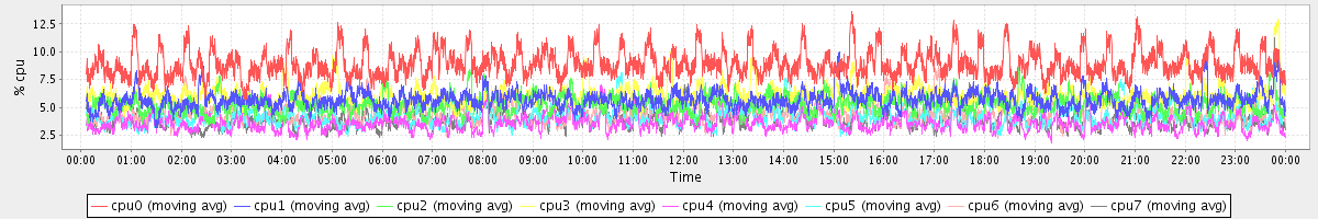 avg(cpu0) = 8.95 avg(cpu1) = 5.72 avg(cpu2) = 5.30 avg(cpu3) = 6.10 avg(cpu4) = 3.62 avg(cpu5) = 4.18 avg(cpu6) = 4.44 avg(cpu7) = 3.99
