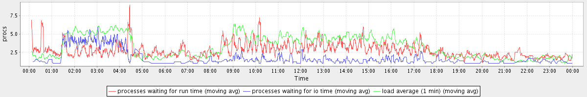 avg(processes waiting for run time) = 2.34 avg(processes waiting for io time) = 0.89 avg(load average (1 min)) = 3.27