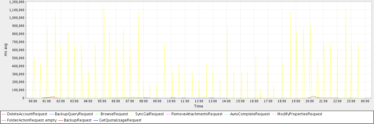 avg(DeleteAccountRequest) = 1278.00 avg(BackupQueryRequest) = 485.40 avg(BrowseRequest) = 992.00 avg(SyncGalRequest) = 41915.31 avg(RemoveAttachmentsRequest) = 949.25 avg(AutoCompleteRequest) = 556.43 avg(ModifyPropertiesRequest) = 675.00 avg(FolderActionRequest.empty) = 1781.25 avg(BackupRequest) = 8521.50 avg(GetQuotaUsageRequest) = 2406.00