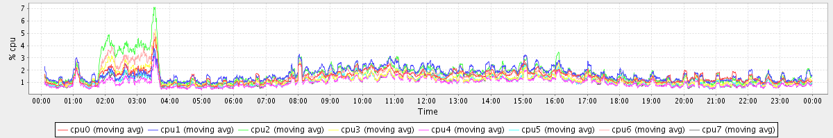 avg(cpu0) = 1.46 avg(cpu1) = 0.38 avg(cpu2) = 0.37 avg(cpu3) = 0.27 avg(cpu4) = 0.23 avg(cpu5) = 0.25 avg(cpu6) = 0.30 avg(cpu7) = 0.25