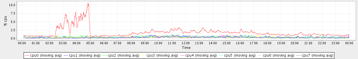 avg(cpu0) = 1.83 avg(cpu1) = 0.34 avg(cpu2) = 0.38 avg(cpu3) = 0.27 avg(cpu4) = 0.25 avg(cpu5) = 0.29 avg(cpu6) = 0.33 avg(cpu7) = 0.23