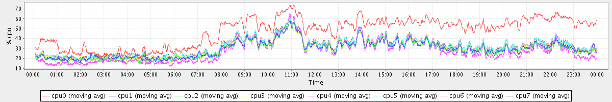 avg(cpu0) = 47.42 avg(cpu1) = 29.70 avg(cpu2) = 29.13 avg(cpu3) = 29.48 avg(cpu4) = 27.10 avg(cpu5) = 31.67 avg(cpu6) = 31.37 avg(cpu7) = 31.99