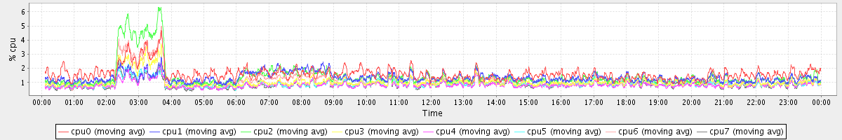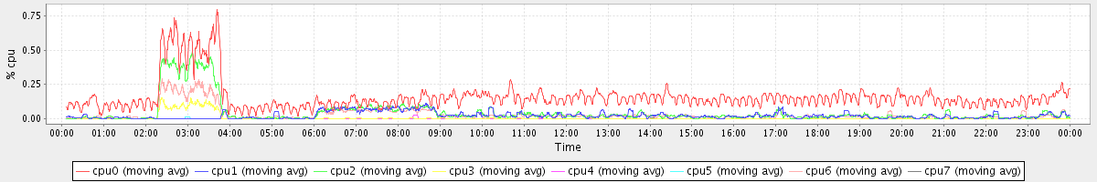 avg(cpu0) = 1.63 avg(cpu1) = 0.27 avg(cpu2) = 0.33 avg(cpu3) = 0.22 avg(cpu4) = 0.20 avg(cpu5) = 0.20 avg(cpu6) = 0.25 avg(cpu7) = 0.22