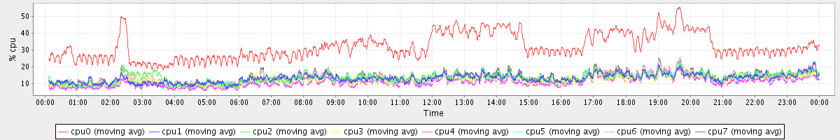 avg(cpu0) = 31.97 avg(cpu1) = 13.03 avg(cpu2) = 13.57 avg(cpu3) = 12.13 avg(cpu4) = 10.56 avg(cpu5) = 12.07 avg(cpu6) = 13.40 avg(cpu7) = 13.56