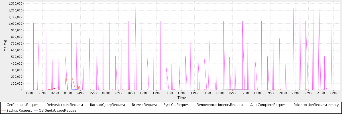 avg(GetContactsRequest) = 2095.06 avg(DeleteAccountRequest) = 17255.50 avg(BackupQueryRequest) = 524.60 avg(BrowseRequest) = 1873.00 avg(SyncGalRequest) = 66522.89 avg(RemoveAttachmentsRequest) = 3226.00 avg(AutoCompleteRequest) = 538.62 avg(FolderActionRequest.empty) = 2235.83 avg(BackupRequest) = 18554.50 avg(GetQuotaUsageRequest) = 969.00