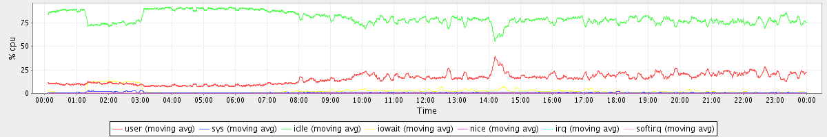 avg(user) = 15.70 avg(sys) = 1.08 avg(idle) = 80.11 avg(iowait) = 2.77 avg(nice) = 0.00 avg(irq) = 0.01 avg(softirq) = 0.32