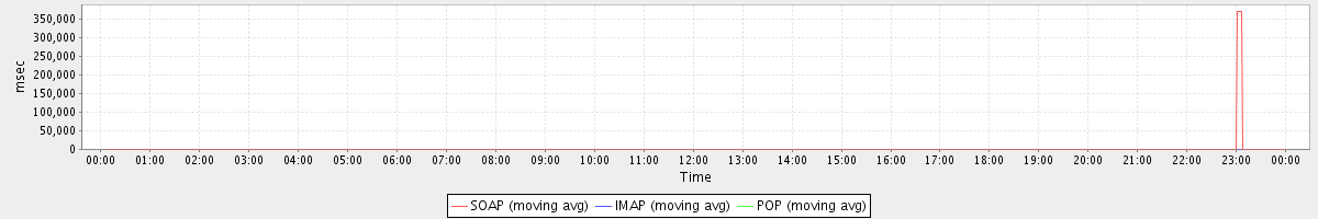 avg(DeleteAccountRequest) = 39945.33 avg(BackupQueryRequest) = 586.60 avg(GetFreeBusyRequest) = 572.51 avg(SyncGalRequest) = 6652.94 avg(SendInviteReplyRequest) = 767.55 avg(RemoveAttachmentsRequest) = 838.00 avg(AutoCompleteRequest) = 880259.12 avg(FolderActionRequest.empty) = 2308.79 avg(BackupRequest) = 8389.00 avg(GetQuotaUsageRequest) = 969.00