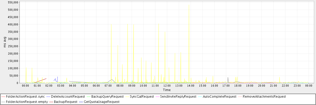 avg(FolderActionRequest.sync) = 12093.00 avg(DeleteAccountRequest) = 22967.00 avg(BackupQueryRequest) = 644.20 avg(SyncGalRequest) = 9325.37 avg(SendInviteReplyRequest) = 654.30 avg(AutoCompleteRequest) = 642.62 avg(RemoveAttachmentsRequest) = 1371.50 avg(FolderActionRequest.empty) = 3072.18 avg(BackupRequest) = 16003.00 avg(GetQuotaUsageRequest) = 1103.00